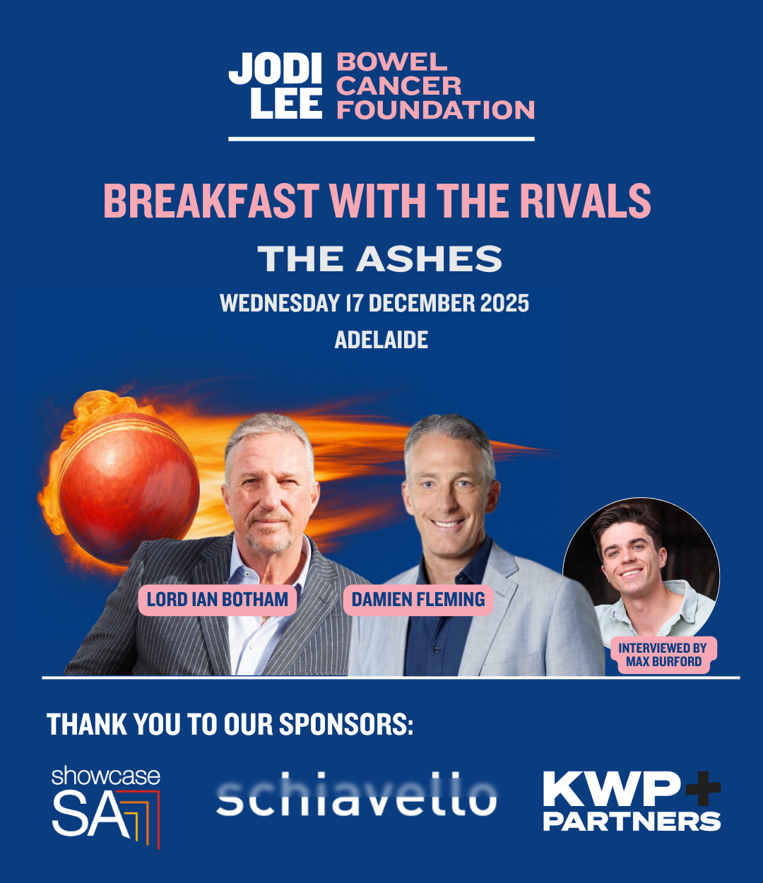 Join the Jodi Lee Bowel Cancer Foundation, Lord Ian Botham and Damien Fleming for an exclusive Charity Brunch, featuring an up-close and personal Q&A session with the cricket legends and Sports Presenter Max Burford before the Test Match action starts at the Adelaide Oval.